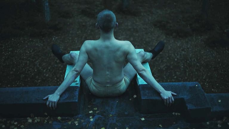 Le poste de secours de Preila surplombe la mer dans son architecture à la fois dure et accueillante, aux lignes et aux reliefs stricts qui lui confèrent une force que les danseurs Marius et Mantas tentent de dominer.