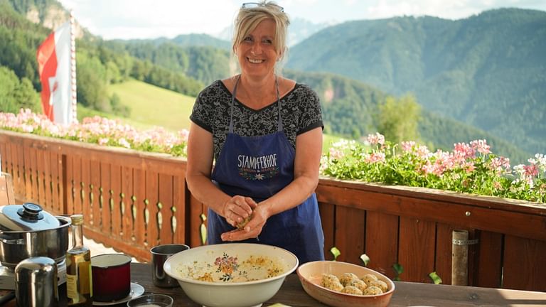 Dans sa ferme familiale, à près de 1 700 mètres d'altitude, Marisa Irsara, réputée pour ses talents culinaires, transmet ses recettes ancestrales à sa fille Julia, dont celle des cajinci artis, des raviolis frits à la farce salée-sucrée. Quant à Igor Comploi, architecte à Ortisei, il conçoit des maisons où la cuisine occupe une place centrale. Lui-même prend plaisir à revisiter la tradition gastronomique locale, comme en témoigne sa lotte savoureuse, qu'il sert enveloppée d'un manteau de tomates séchées. Dans le sud de la région, le massif du Schlern aligne les fermes laitières. Mais Veronika Stampfer, elle, élève des porcs. Préparant son propre lard, elle l’utilise pour ses knödel, un classique du Tyrol du Sud.