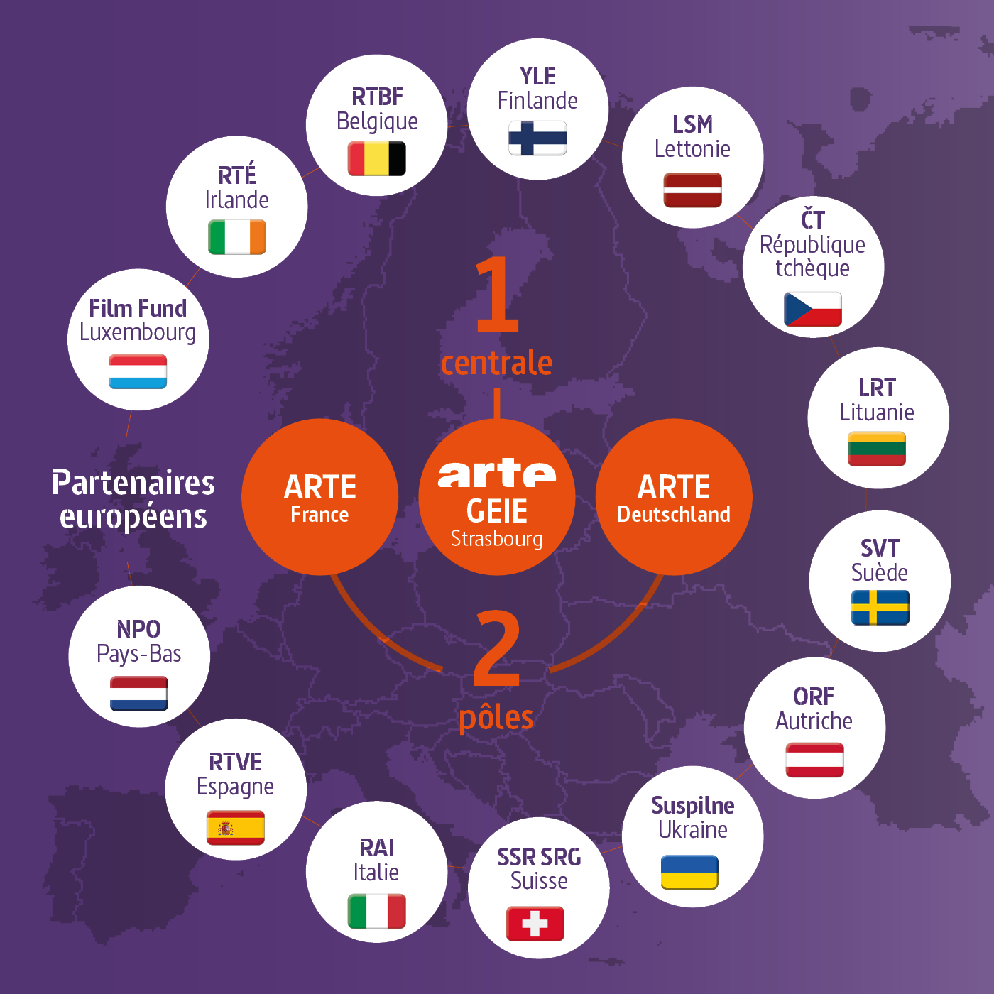 En fond de carte, l’Europe. Au milieu, le siège ARTE GEIE à Strasbourg. De part et d’autre, les deux pôles ARTE France et ARTE Deutschland. Tout autour du groupe ARTE, les partenaires européens : le Film Fund Luxembourg, la RTÉ en Irlande, la RTBF en Belgique, YLE en Finlande, la LSM en Lettonie, la ČT en République tchèque, la LRT en Lituanie, l’ORF en Autriche, Suspilne Ukraine, la SSR SRG en Suisse, la RAI en Italie, la RTVE en Espagne, la SVT en Suède et le NPO aux Pays-Bas.