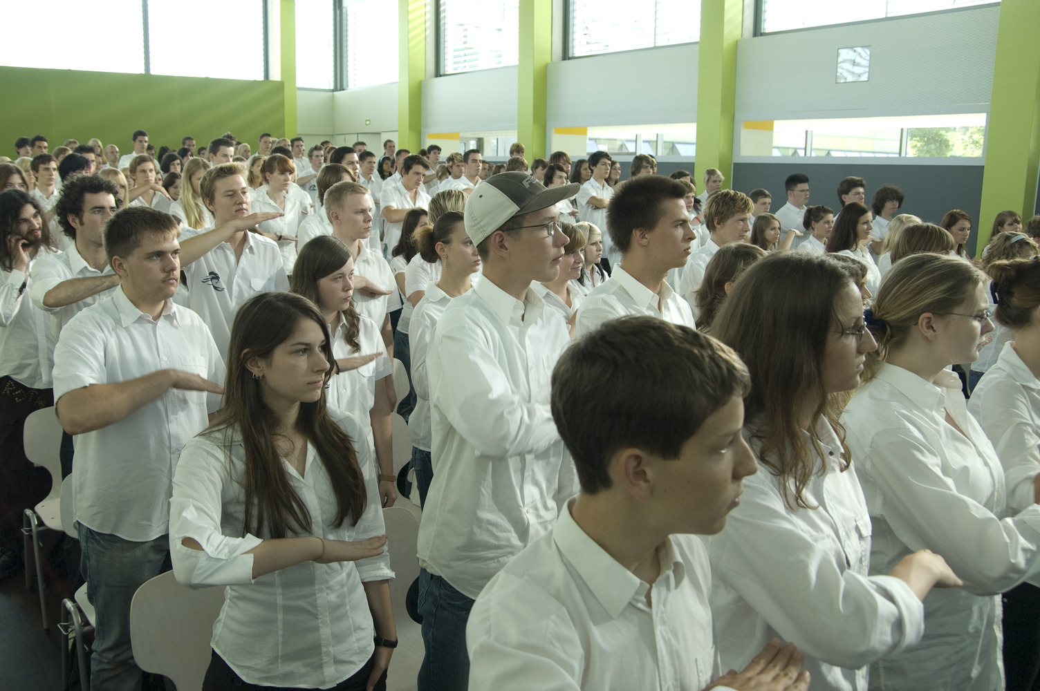 Dès le deuxième jour, presque tous les élèves viennent en cours en uniforme, c’est-à-dire vêtus d’une chemise blanche. Ceux qui ne s’intègrent pas sont exclus. En plus de l’uniforme, le groupe se dote d’un logo puis d’un salut. « La vague » devient de plus en plus incontrôlable mais l’enseignant ne s’en rend pas compte immédiatement. Et il est trop tard quand il comprend qu’il est allé trop loin.