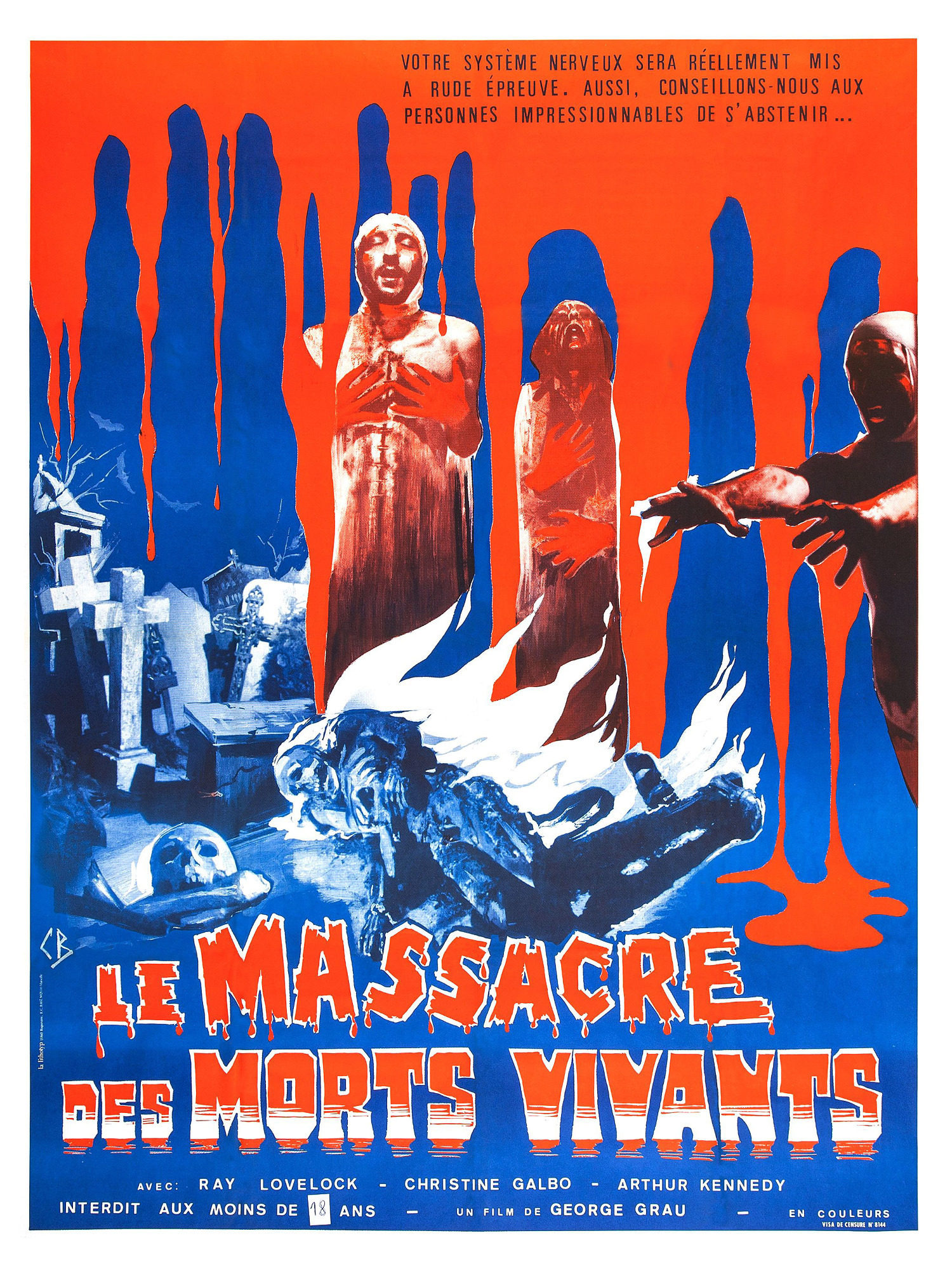 Cérémonie sanglante (1972) est une biographie romancée de la comtesse Bathory interprétée par la sublime Lucia Bosé (Chronique d’un amour) et la gironde Ewa Aulin (La mort a pondu un œuf), avatar tardif des mélodrames fantastiques à costumes tandis que Le Massacre des morts-vivants est une excellente imitation latine (malgré sa localisation dans la campagne anglaise) du chef-d’œuvre de George A. Romero La Nuit des morts-vivants. Le film de Grau appartient au filon « gore » apparu dans les années 70 en Italie sous l’égide de Lucio Fulci, spécialiste de ce sous-genre qui connaîtra de nombreuses contrefaçons. Grau soutient la comparaison avec les meilleurs films de zombies, par sa violence sanguinolente, son climat d’angoisse et son propos subversif et pessimiste. Grau respecte le cahier des charges du cinéma d’exploitation de l’époque et assène plusieurs scènes chocs servies par des effets spéciaux répulsifs. Cauchemar hypnotique aux multiples rebondissements, Le Massacre des morts-vivants est aussi un manifeste écologiste et libertaire, qui dénonce la pollution dans les campagnes et les méthodes de la police, via le portrait d’un flic fasciste et borné interprété par Arthur Kennedy qui acceptera de tourner en Italie dans les années 70 à l’instar d’autres acteurs américains de sa génération.